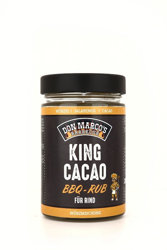 La sua delicata piccantezza è accompagnata da una piacevole sapidità, completata dal cacao. Questa combinazione conferisce alla carne un aroma corroborante e una delicata consistenza che si scioglie in bocca. Per garantire che il vostro cibo grigliato soddisfi gli dei del barbecue, offritegli un po' di Don Marco's King Cacao.