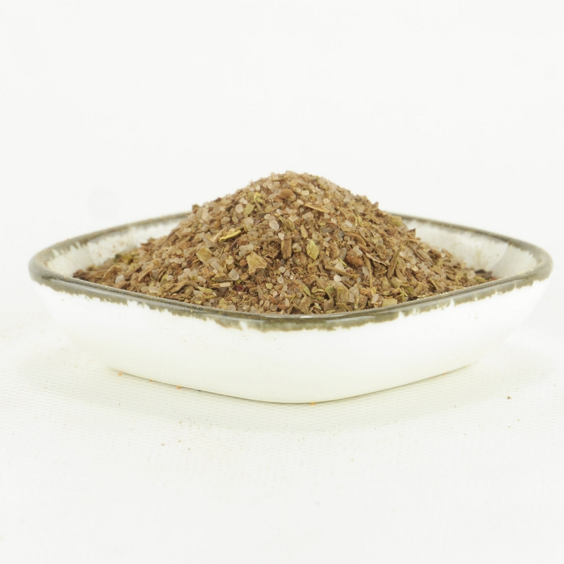 Sale marino, zucchero di canna grezzo, polvere di pomodoro, cacao in polvere 6%, aglio, origano, pepe, cipolla, peperoncino jalapeno.