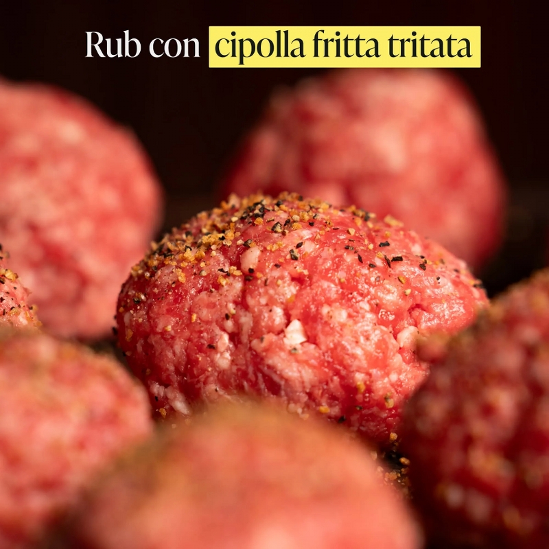 Protagonista assoluta di questo Rub è la cipolla fritta e tostata, un ingrediente scelto per la sua straordinaria complessità aromatica. A differenza della cipolla cruda, qui troviamo dolcezza, profondità e una ricchezza umami naturale che si sprigiona non appena la carne tocca la piastra rovente.