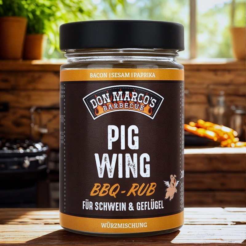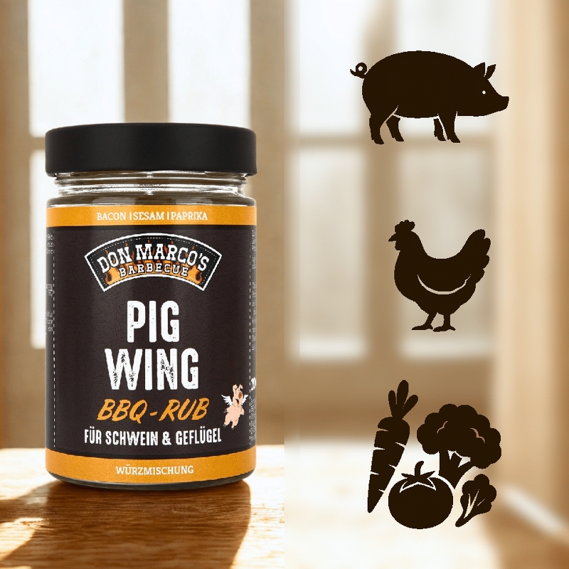PigWing Rub è studiato per sostituire completamente le marinate a base di olio. Funziona come un condimento secco che viene applicato direttamente sulla carne e deve essere lasciato marinare per almeno 30 minuti. Anche il pollame con la pelle trae beneficio da una marinatura notturna. Per una marinata umida, non dovrebbe essere a base di olio, ma piuttosto preparata con succo o acqua per garantire un'aderenza e una caramellizzazione ottimali. Poiché la miscela è relativamente salata, una quantità di circa 20-30 grammi per chilogrammo di carne è più che sufficiente, il che la rende molto economica.