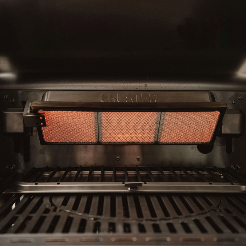 CRUSTER®: bruciatore ceramico regolabile in altezza e inclinazione, fino a 800 °C di calore radiante per rosolature e gratinature estreme.