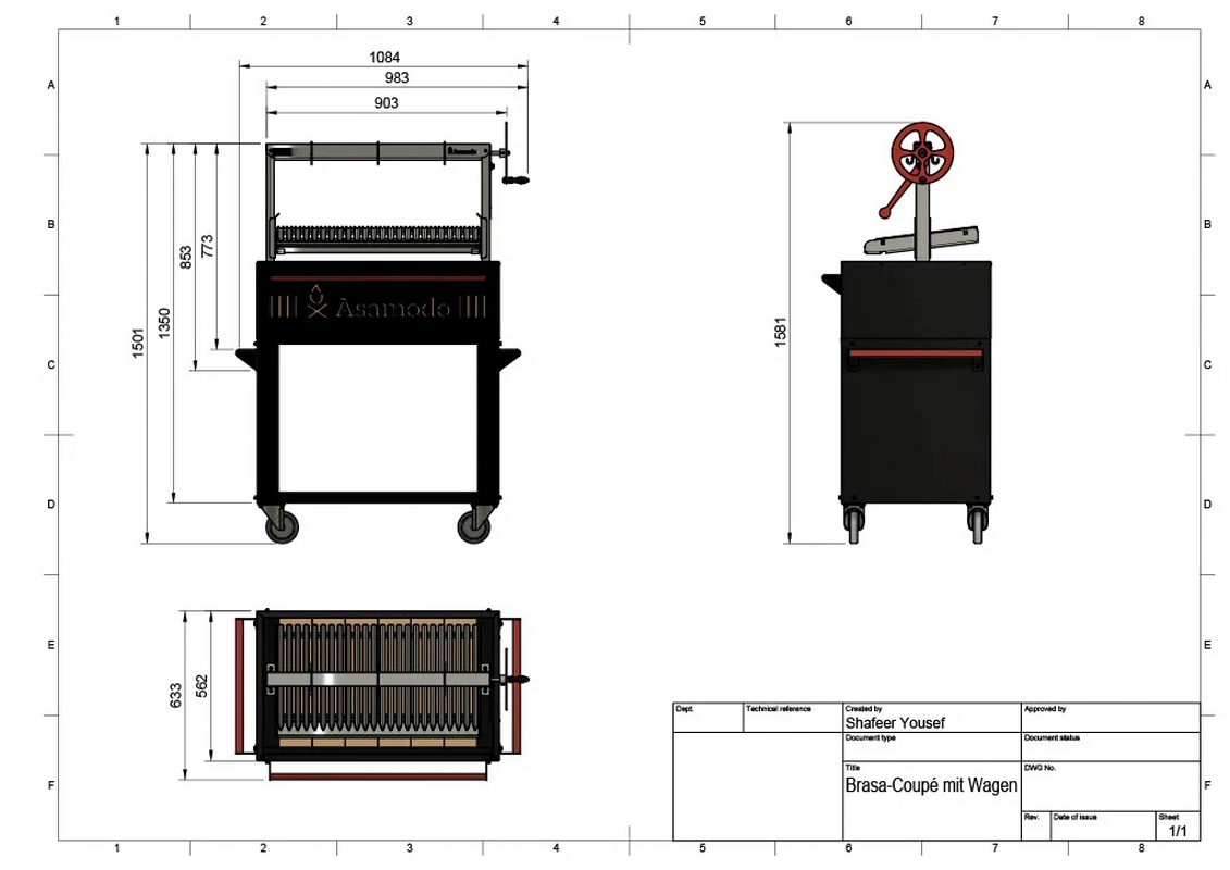 - Dimensioni esterne del barbecue (con carrello): altezza 1350 mm x larghezza 1084 mm x profondità 633 mm