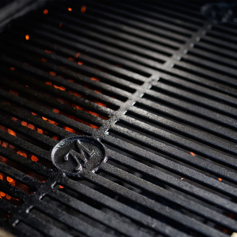 - Include griglie in ghisa reversibili per l'affumicatura lenta e bassa o per la cottura a fuoco vivo.