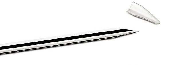 La spada è in acciao inox, larga e con forma a "V" per sostenere meglio la carne e per essere più stabile quando appoggiata direttamente sul bbq o sull'apposito "ring". Ha il manico in Polywood, speciale miscela di resina e legno e pesa circa 150 gr. E' dotata di un cappuccio in silicone per ragioni si sicurezza.